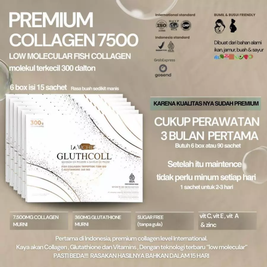LA VICHI GLUTHCOLL disebut premium karena memiliki kandungan yang gak main-main diperhitungkan dengan baik kandungan dan batas-batas aman yang benar-benar bisa efektif bukan hanya sekedar gimmick.